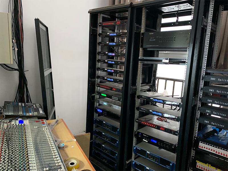 放大設備——指對經過調控設備混音輸出、信號處理后的信號進行后級功率放大設備,這里指專業功率放大器;重放設備——指將經過后級功率放大器放大的音頻信號進行電—聲轉換并釋放表現出來人耳可懂的聲頻信號的設備,這里指揚聲器;